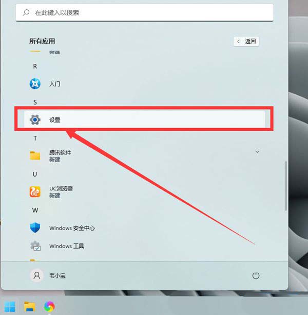 1、按 Win 键,或点击任务栏上的开始图标,在所有应用下,找到并点击设置打开;