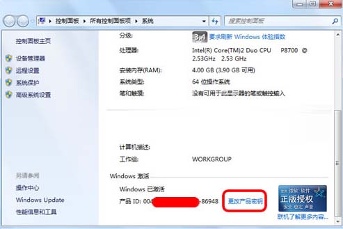 对于这种情况,在Win7开始菜单“计算机”图标上点击鼠标右键 - 点“属性”打开系统属性面板,然后点击“更改产品密钥”(如下图1所示),输入“6K2KY-BFH24-PJW6W-9GK29-TMPWP”(如下图2所示),接受微软激活服务器验证之后,就会跳出一个“此Windows副本不是正版” + “正版标识” + “立即联机解决”的界面。点击“立即联机解决”,即进入正版验证过程。验证结果:Windows验证成功!现在,您可以利用正版Windows提供的所有功能,包括附加功能。