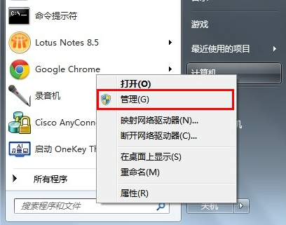 第六步 点击“开始菜单”,对“计算机”单击右键选择“管理”转到第七步;