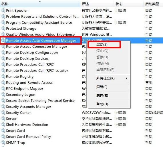 第八步 找到服务“Remote Access Auto Connection ManagerRemote ”,如果未开启,单击右键,选择“启动”;