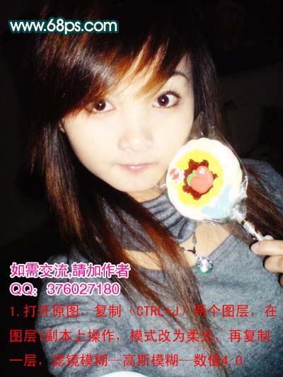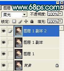 1、打开原图素材,按Ctrl + J两次,复制两个图层,把图层1副本的图层混合模式改为“柔光”,然后再复制一层,执行:滤镜 > 模糊 > 高斯模糊,数值为4,图层混合模式为“柔光”不变。