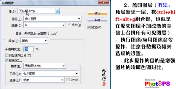 2、新建一个图层,按Ctrl + Alt + Shift + E盖印图层,执行:图像 > 应用图像,参数设置如下图。操作的目的是增强照片的对比色。
