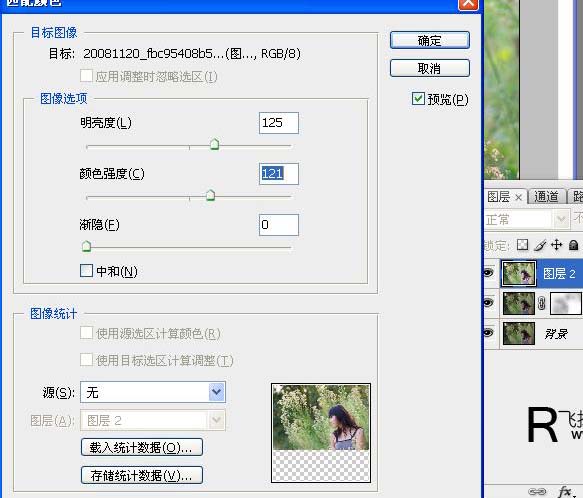 2、盖印可见图层.ctrl+shift+alt+e,然后打开:图像调整-匹配颜色-数据如图。目的加强颜色饱和。接着添加图层蒙版-不透明度设为80把人物擦出来。
