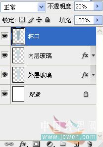 8、按住Ctrl键点击内层玻璃图层,新建一层,命名“杯口”,填充图层颜色为:#99b2bb,不透明度20%。