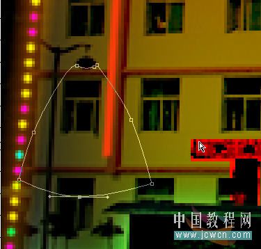 新建一层后,把路径变成选区并填充白色,动感模糊方向90,距离4,混合模式:叠加,ctrl+t自由变换,将光线拉到地面,再复制几个分别移动到各个路灯处,如图22