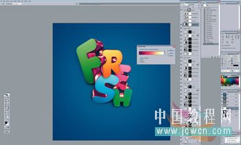 11、现在已经堆栈实现了在第10步创建的层之上或之下添加附加的调节层,所以可以随心调节亮度,对比和颜色。下一步,拷贝这些调节层到其它的字母,然后再逐一对其做细微的调节来得到一个更加和谐的配色方案