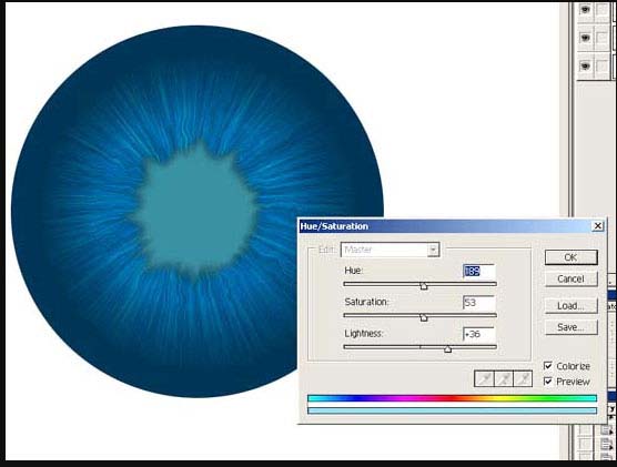8、复制瞳孔层,并且改变颜色,使用菜单“图像>调整>色相/饱和度”或者简单地“Ctrl U”,设置参数像下图。