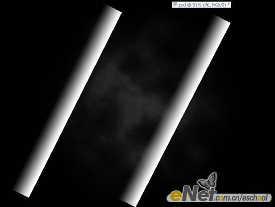 第七步:在图层【云】上面新建一层,命名为【光】。在工具箱中选择【矩形选框工具】,绘制一个如下图所示的矩形选区。然后选择【渐变工具】,确认前景色为白色,在选区中有左至右拉一个从前景色到透明的线性渐变,效果如下图所示。