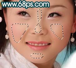 3、新建一个图层,盖印图层,选择减淡工具,曝光度为:5%左右,把图3所示的区域涂白一点,增强皮肤的质感,效果如图4。