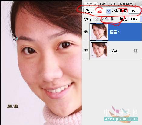 2、按Ctrl + J把背景图层复制一层,图层混合模式改为“柔光”,图层不透明度改为:24%。