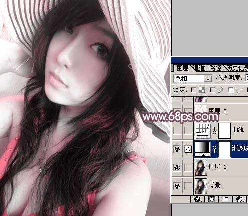 #p# 1、打开原图素材,创建渐变映射调整图层,参数设置如图1,确定后把图层混合模式改为“色相”,效果如图2。