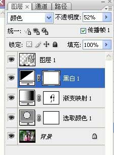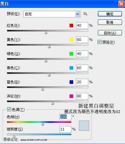 3、创建黑白调整图层,参数设置如下图,确定后把图层混合模式改为“颜色”,图层不透明度改为:52%。