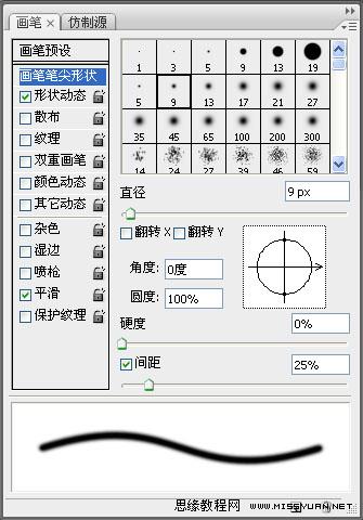 8、将前景色设为白色,背景色设为黑色,选择笔刷工具,打开笔刷设置面板,笔刷大小为9,硬度0%,并勾选形状动态(取默认设置)。