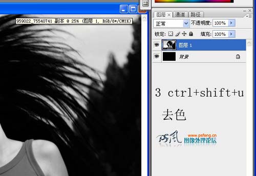 3、回到图层1,按Ctrl + Shift + U去色。