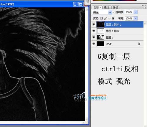 6、把图层1复制一层,按Ctrl + I反相,然后把图层混合模式改为“强光”。