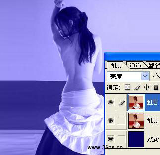 5、复制一个美女图层,将两个美女图层的图层模式都设置为亮度。这时候图片呈现蓝色。