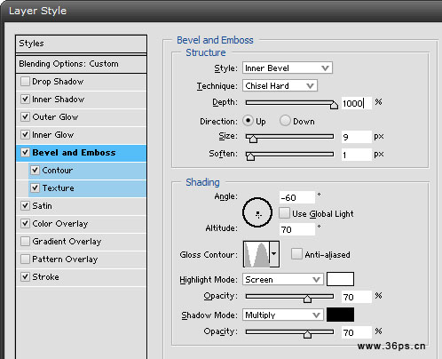 斜面与浮雕,将等高线和纹理都选择上。样式选择内斜面,方法选择雕刻清晰,高光模式滤色,暗调模式正片叠底,其他设置如图: