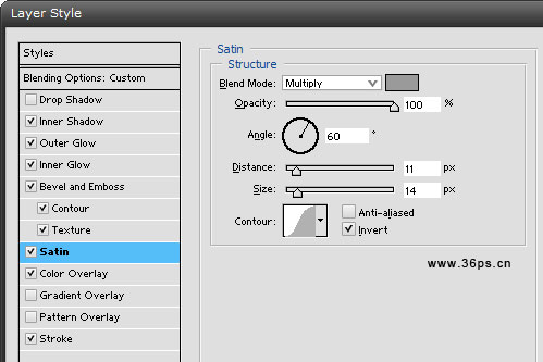 注:纹理可以选择一些比较空的图案(当然你可以找一些密的图案然后将缩放设置为500%),你可以根据你的喜好来选择纹理。光泽,混合模式正片叠底,其他设置如图: