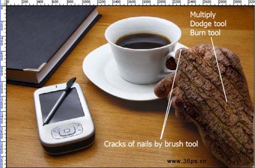 1、打开原图素材,再打开下图所示的树皮,把树皮拖进来,适当的变换角度,把原图的手遮住如图2。
