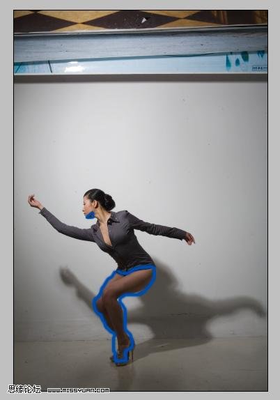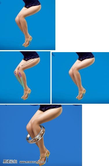 2、扣出人物,调整照片,注意肤色的对比和过度,这张照片腿上的光没有补到位需要调整: