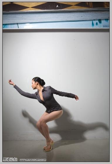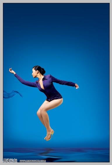 #p# 3、调整皮肤色彩、服装的色彩,主要用可调整图层,然后加上背景素材、倒影等,注意脚背往下绷一点是用自由变换的变形调整滴。飘带的制作可以参照下列教程:Photoshop制作飘逸的半透明丝绸