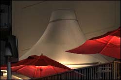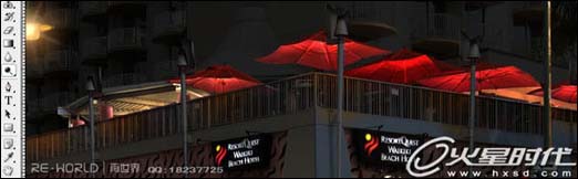 15、现在开始做楼上的遮阳伞,遮阳伞我也是用减淡工具处理出来的,需要注意的是要确定好遮阳伞的灯具的位置,我把灯具放在遮阳伞内侧,然后使用减淡工具画出光感,和灯光照到伞的支撑架上面的高光,旁边的凉棚也是用的这种方法。