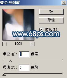 6、新建一个图层,盖印图层,执行:滤镜 > 杂色 > 蒙尘与划痕,参数设置如图14,确定后按Ctrl + B调整色彩平衡稍微调青一点,然后把图层混合模式改为“柔光”,加上图层蒙版用黑色画笔把人物部分擦出来,效果如图15。
