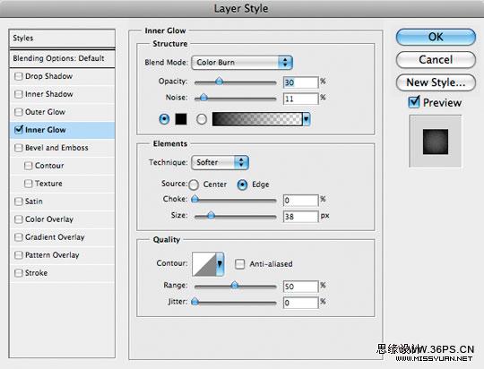5、给顶层Card Top添加图层样式。内发光:混合模式为颜色加深,方法选择柔和,其他设置如下: