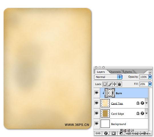 7、在顶部新建一个图层。取名为Burn。点击这个图层(Burn图层),按一下Ctrl+Alt+G(CS2版本以上的命令,CS的命令是Ctrl+G),创建为剪切蒙板。此时你会看到下面第二张图片的效果将这个图层的填充度修改为20%。