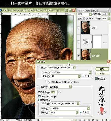 1、打开原图素材,把背景图层复制一层,执行:图像 > 应用图像,参数设置如下图。