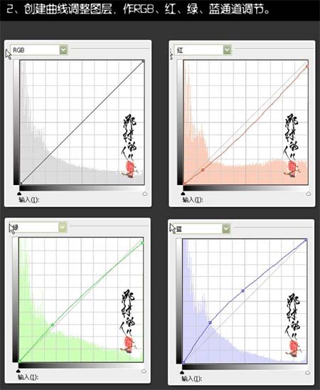 2、创建曲线调整图层,对4个通道进行调整,参数及效果如下图。