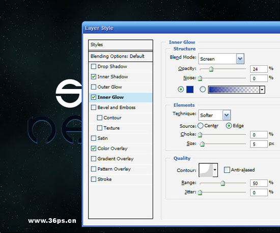 7、为文字添加效果。 首先是颜色叠加,使用颜色为黑色。其他设置不变。其次是内发光,如下图设置。混合模式为滤色。方法为柔和。其他设置如下图。最后是内阴影。内阴影设置:颜色#54a4ff,混合模式为滤色,距离1,大小2,角度-90度(负90度),其他都保持默认。注意:下图只给出内发光的调节界面,其他两个效果见上面文字描述。