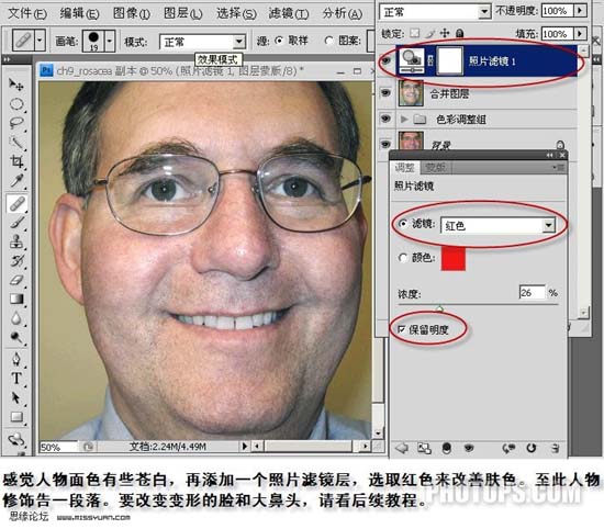 #p# 9、感觉人物面色有些苍白,创建照片滤镜调整图层,选取红色来改善肤色。至此人物修饰告一段落。下面开始改变脸和大鼻头。