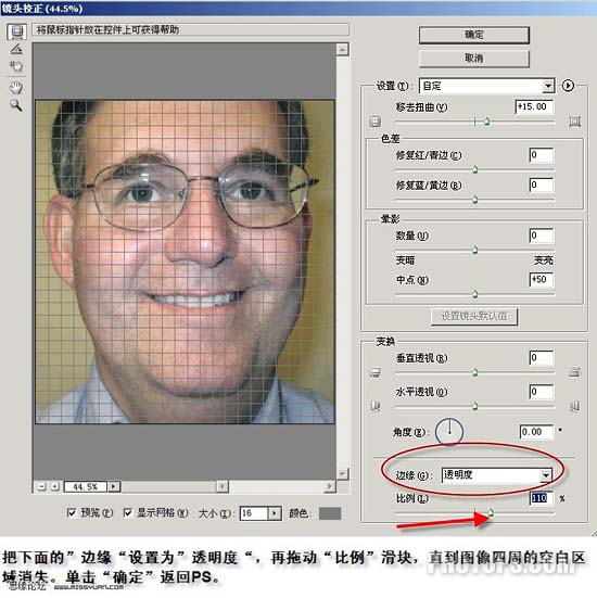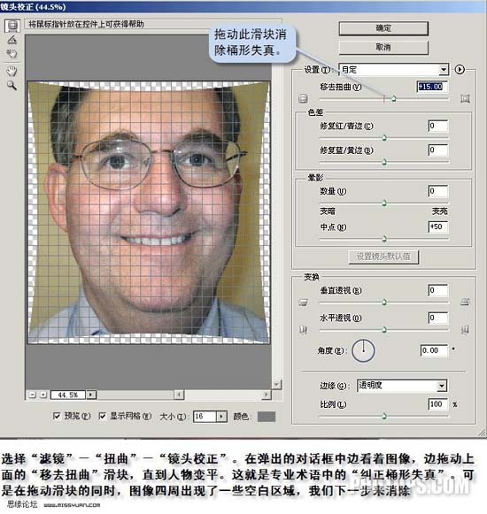 #p# 11、选择菜单:滤镜 > 扭曲 > 校正镜头。在弹出的对话框中边看着图像,边拖动上面移去扭曲直到人物变平。这就是专业术语中的纠正桶形失真。可是再拖动滑块的同时,图像四周出现了一些空白区域,我们下一步来消除。
