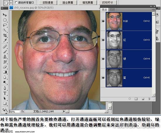 #p# 1、打开原图素材,点通道面板,检查通道,可以看到红色通道损伤较轻,绿色和蓝色通道纹理较多。我们可以用通道混合器调整层来突出好的通道,隐藏坏的通道。