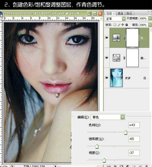 2、创建色相/饱和度调整图层,对青色进行调整,参数设置如下图。