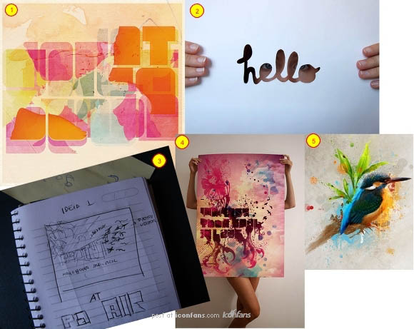 1、我的整个创作的第一步,是根据我的创作大意寻找了许多相关的图片素材,同时我开始对我的创作过程进行规划。这样我便在收集图片的时候就开始定下我的设计路思路与方向。当然,我可以在创作的时候改变我的思路,所以我收集了许多效果的图片,都是我喜欢的以及在此次设计中会应用到的(下图中的1/2/4/5),紧接着我便把我的想法画在了纸下(下图的3),并融入了我的设计思路,同时也形成了我的一个设计理念。
