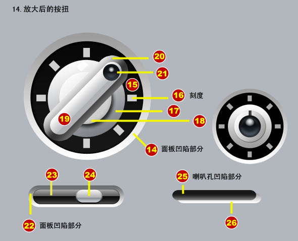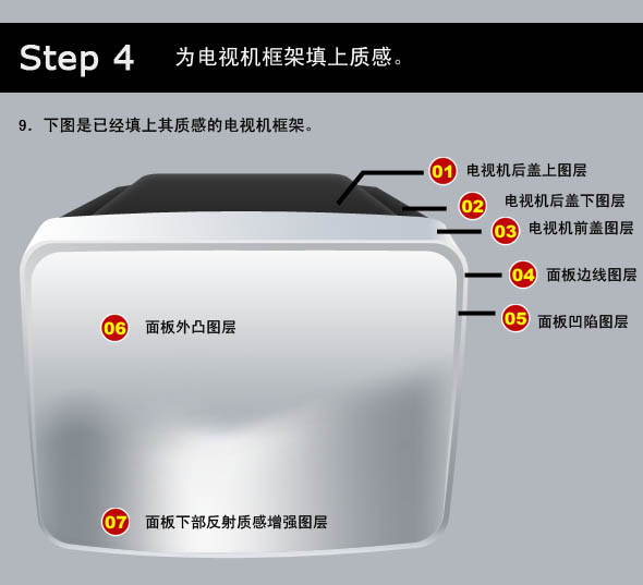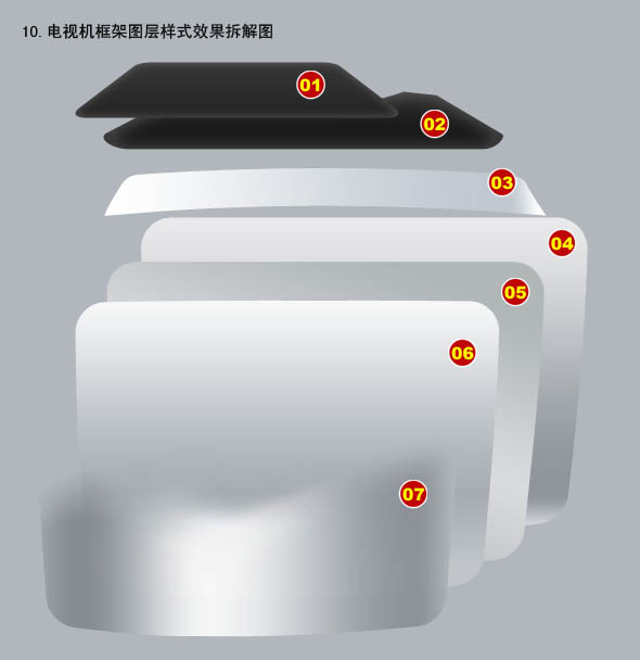 10、电视机框架图层样式效果拆解图,下图分成7个部分,后面详细介绍这7个部分的细节制作。