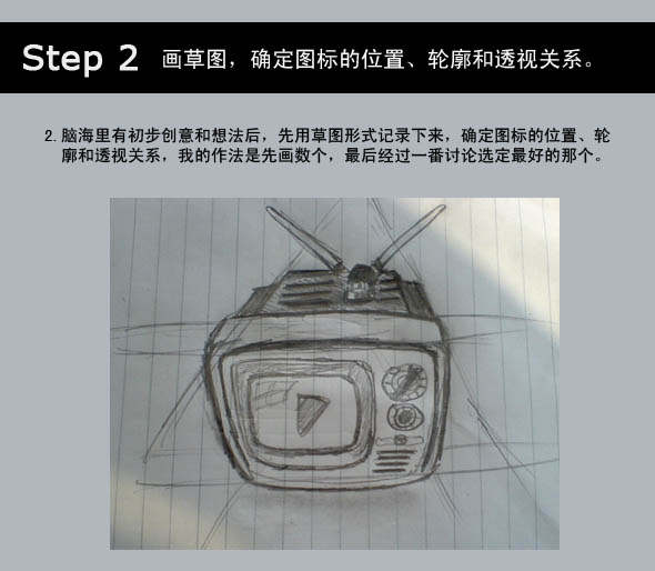 #p# 2、脑海里有初步的创意和想法后,信用草图形式记录下拉,确定图标的位置、轮廓和透视关系。