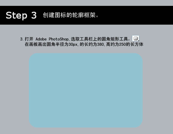 3、打开PS新建一个大小适当的文件,用圆角矩形工具,在画板画出圆角半径为30PX,的380 * 250像素的长方体。