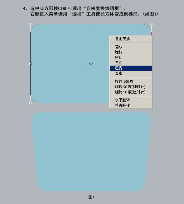 4、选中长方体按Ctrl + T调出“自由变换编辑框”,右键进入菜单选用“透视”工具使长方体变成梯形。