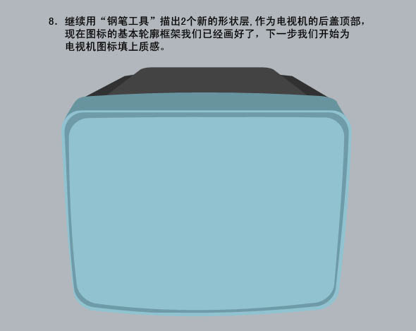 #p# 8、继续用“钢笔工具”描出2个新的形状层,作为电视机的后盖顶部,现在图标的基本轮廓框架我们已经画好了,下一步我们开始为电视机图标添上质感。