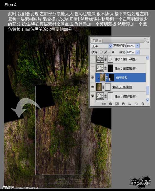 4、此时,我们会发现,左肩部分裂缝太大,色彩也较深,很不协调,接下来就处理左肩。复制一层素材图片,混合模式改为“正常”。然后旋转并移动到一个左肩裂缝较少的部分,按住Alt在两层素材之间点击,为其添加一个剪切蒙版。然后添加一个黑色蒙版,用黑色画笔涂出需要的部分。
