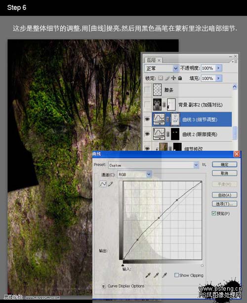 6、这一步是调整细节,创建曲线调整图层,适当调亮一点,用黑色画笔在蒙版里涂出暗部细节。