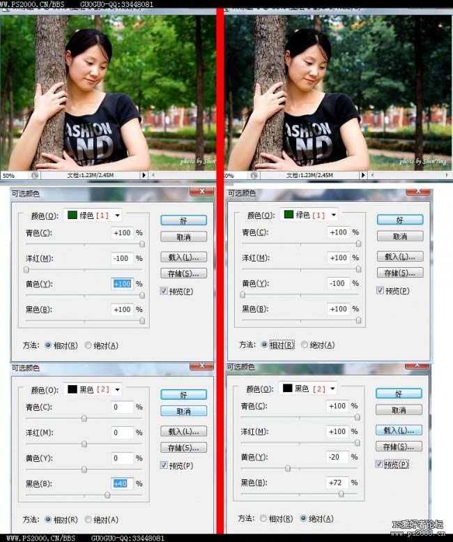 [1]绿色-根据你不同需要调节。如果+青黄黑-红=看起来非常绿,要是想秋天,或者特殊效果。.就视情况调(如右图) 我很难解释。还是自己多试试吧! [2]一般调节黑色我是为了让头发,眉毛等等,黑色地方在明显些。背景黑色地方在暗些,对比强烈。照片有立体感!而对比度则是全部调节,相比效果差很多。