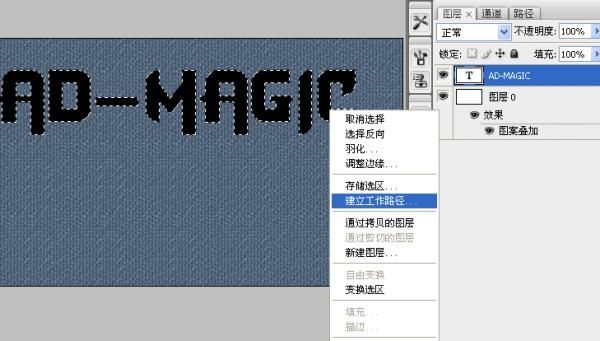 4、创建该文字图层的选区,选择矩形选框工具,点鼠标右键建立工作路径。(按住Ctrl+点击该文字图层创建 选区,如果你是用的是PS2之前版本,需要点击图层蓝色背景,如果是ps3需要单击预览框!大家知道吧)