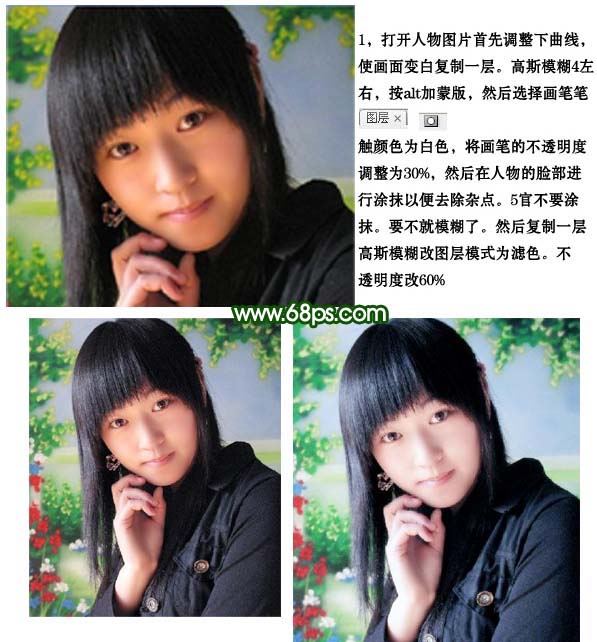 #p# 1、打开人物图片,首先调整下曲线是面部变白,然后复制一层,执行:滤镜 > 模糊 > 高斯模糊,数值为4,确定后按住Alt键加上图层蒙版,然后选择画笔工具,颜色设置为白色,画笔透明度为:30%,然后在人物的脸部进行涂抹以便去除杂点。五官不要涂抹。要不就模糊了。然后复制一层,高斯模糊,数值自定,把图层混合模式改为“滤色”,不透明度改为:60%。