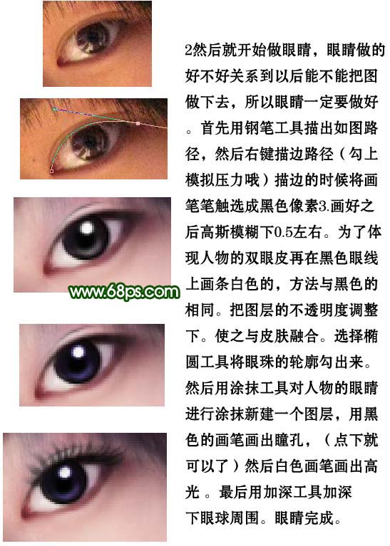 2、眼睛部分处理,眼睛做的好不好关系到以后能不能把图做下去,所以眼睛一定要做好。首先用钢笔工具描出如下图第二幅所示的路径,右键描边路径,勾选模拟要来。描边的时候将画笔笔触选出成黑色像素3.画好之后高斯模糊下0.5左右。为了体现人物的双眼皮,再在黑色眼线上画条白色的,方法与黑色的相同。把图层的不透明度调整下,使之与皮肤融合。选择椭圆选框工具将眼珠的轮廓抠出出来,用涂抹工具对人物眼睛进行涂抹,新建一个图层,用黑色的画笔画出瞳孔,然后用白色画笔画出高光。最后用加深工具加深下眼球周围。眼睛完成。