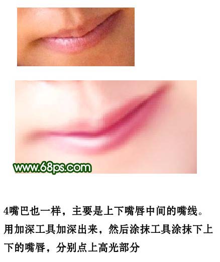 4、嘴巴也一样,主要是上下嘴唇中间的嘴线。用加深工具加深出来,然后用涂抹工具涂抹下上下嘴唇,分别点上高光部分。