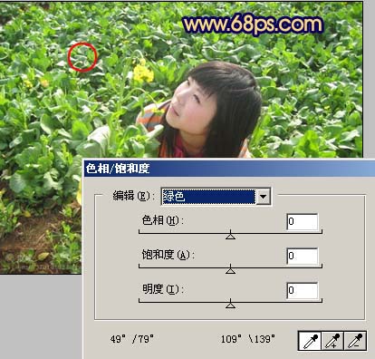 #p# 1、打开原图素材,创建色相/饱和度调整图层,选择绿色,然后用吸管在图片中吸取菜叶的绿色,如图1红圈位置,吸取后调整参数,如图2,效果如图3。